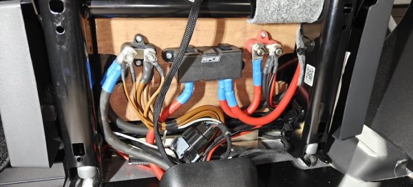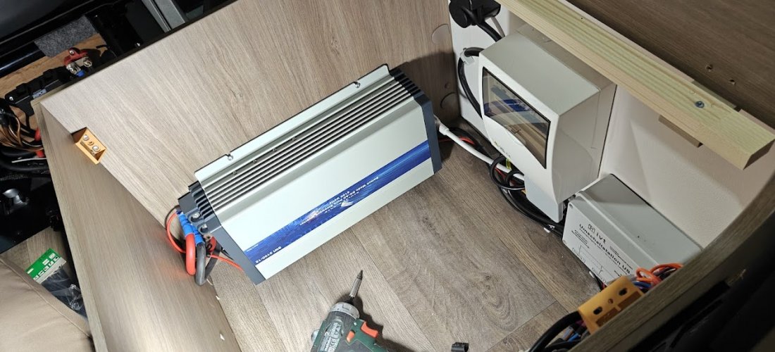De lithiumaccu is geplaatst onder de bijrijdersstoel voor een strakke, ruimtebesparende inbouw. De krachtige Samlex omvormer 2100W zorgt voor een betrouwbare 230V-voorziening aan boord, ook zonder walstroom.